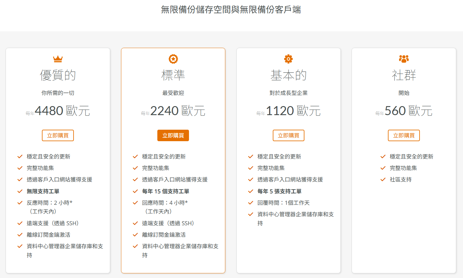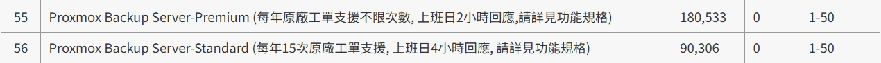 當然有虛擬平台後,需要搭配備份平台,下圖為PROXMOX 備份的計價方式,一樣是採取訂閱的方式計價,不過沒有備份主機數量與容量限制,算是比較實惠的計價方式