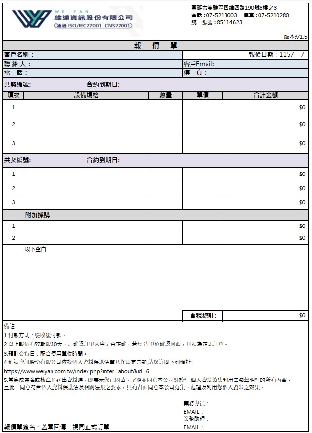 本公司因受理客戶問題報修與報價,蒐集您的個人資料包括中文姓名、服務單位、電子郵件地址、LINE ID、聯絡電話及通訊地址,詳如維護紀錄單與報價單。